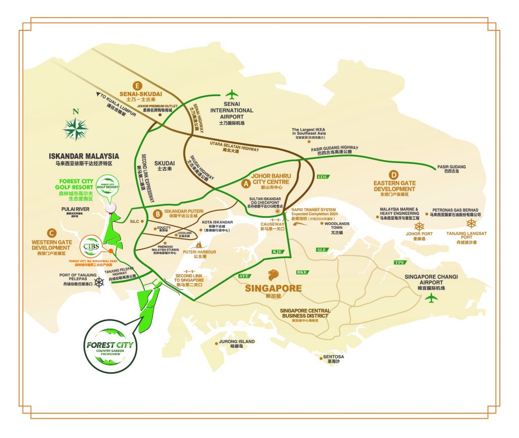 Spanning approximately 30 sq. km, Forest City consists of 4 man-made islands (approx 20 sq. km), golf resort and IBS industrial park (10 sq. km), with a construction period of 25-30 years.